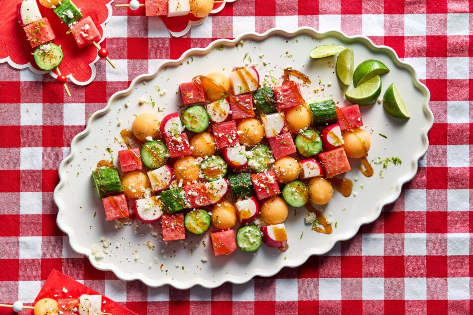 The checkered salad trend doesn’t require lettuce. Instead, it focuses on cubed or sliced ingredients (think cucumbers, melons, feta cheese, or olives) laid out in an adorable checkerboard grid on a serving tray.