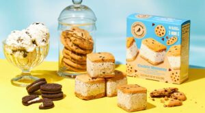7. After freezing, turn your Twix slab onto a cutting board and cut into 12 even squares with a sharp knife. Place squares on a non-stick parchment lined baking tray and return to the freezer.