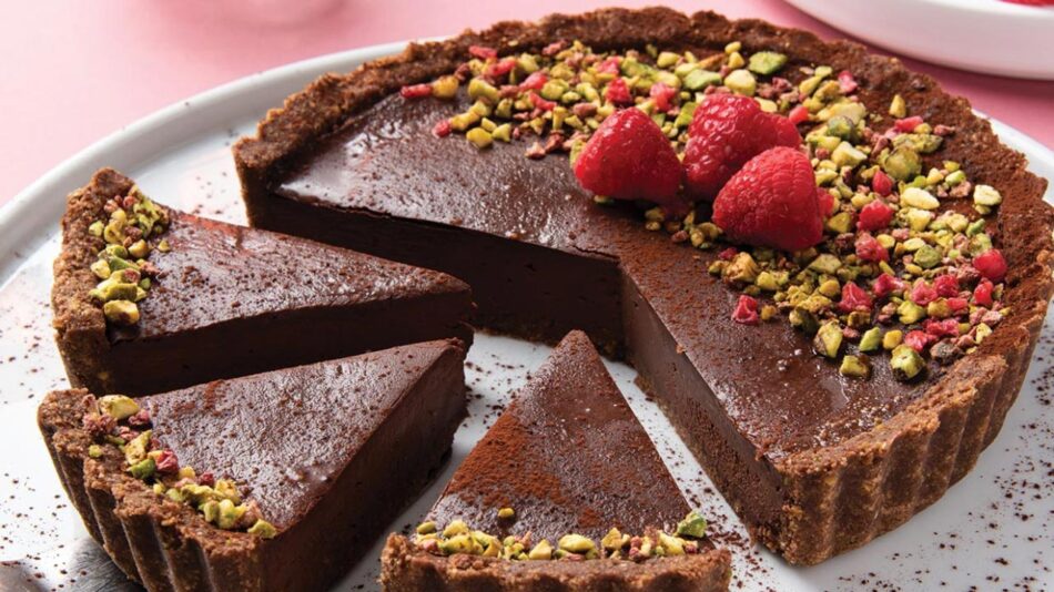 Finished with jewel-like raspberries and a scattering of pistachios, it’s a showstopping vegan dessert that’s perfect for special occasions or romantic nights in.