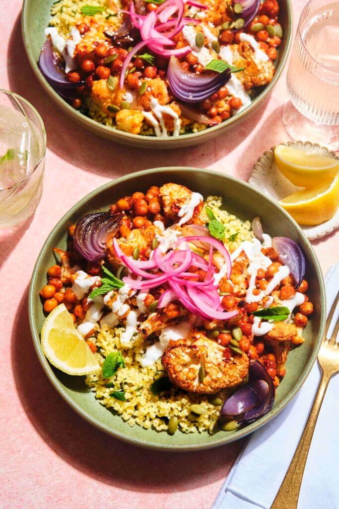 • Spicy Kimchi Fried Rice with Crispy Tofu – Bold, punchy fried rice topped with kimchi and garlic mayo.