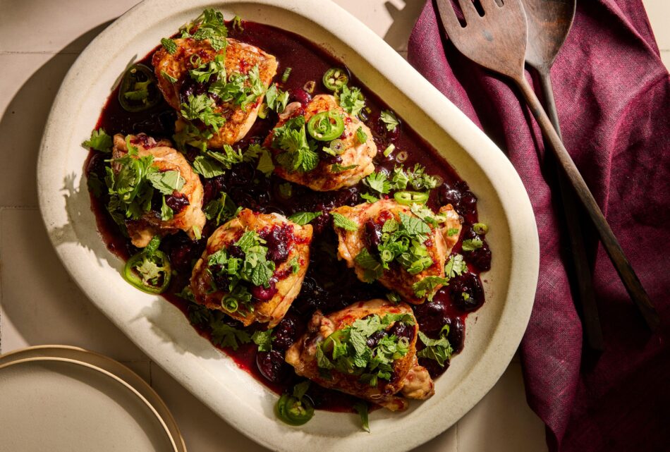 - Try it with another protein. Bone-in, skin-on chicken thighs are full of flavor and are often budget-friendly. But they’re far from the only proteins that would play nicely with the cherry sauce and herb salad. Try that sweet-heat duo with baked pork chops, grilled pork tenderloin, or braised short ribs if you prefer those over chicken thighs or if they’re a better deal at the supermarket.