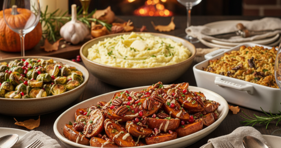 These four work together because they cover all the bases—something sweet, something green, something creamy, something savory. They also hit different textures: crispy pecans, charred Brussels sprouts, smooth potatoes, crusty stuffing.