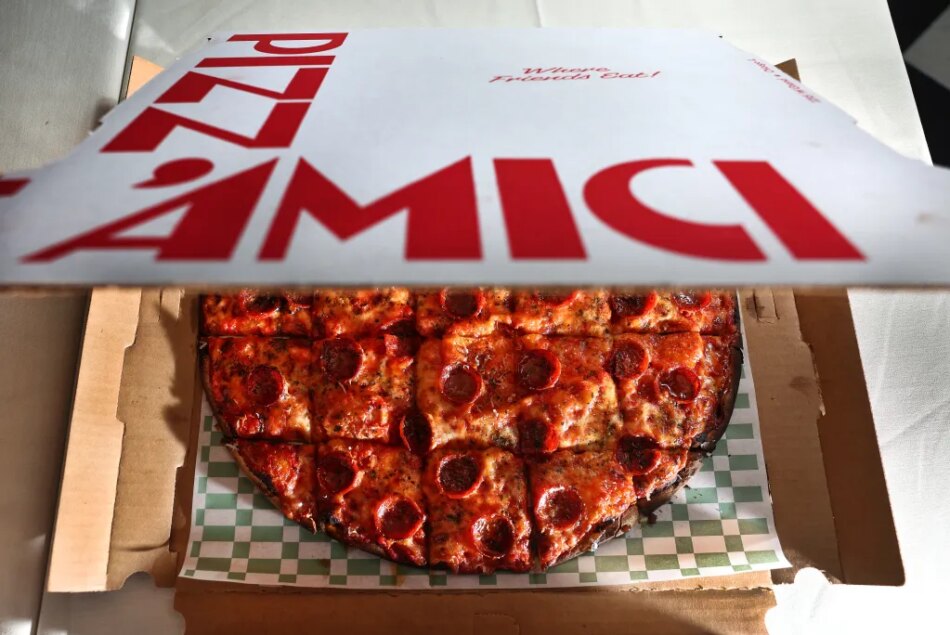 Pepperoni and Mike’s hot honey drizzle pizza in a takeout box at Pizz’amici on Sept. 25, 2025. (Chris Sweda/Chicago Tribune)
