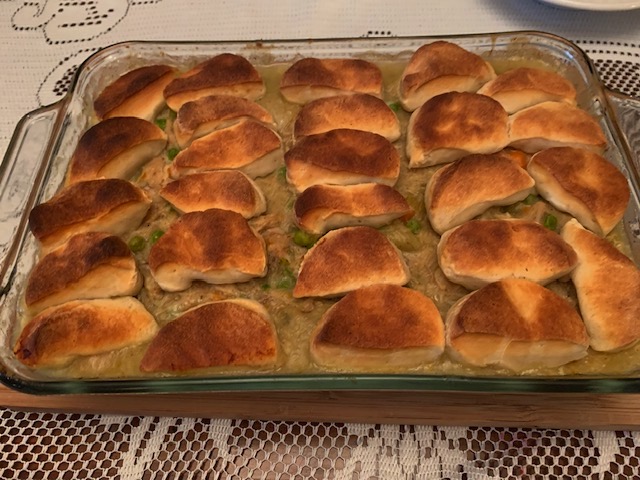 Top with biscuits (recipe below) and cook at 425 degrees until biscuits are brown and filling is bubbly, about 15-18 minutes.