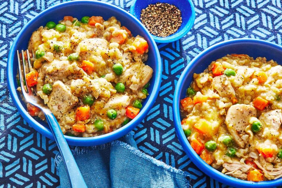 If you love the soft, tender texture of risotto, you’ll find a lot to love in this slow-cooker chicken and rice recipe. The dish is herby and savory, with a nice lift from Cheddar cheese, vegetables, and Dijon mustard.