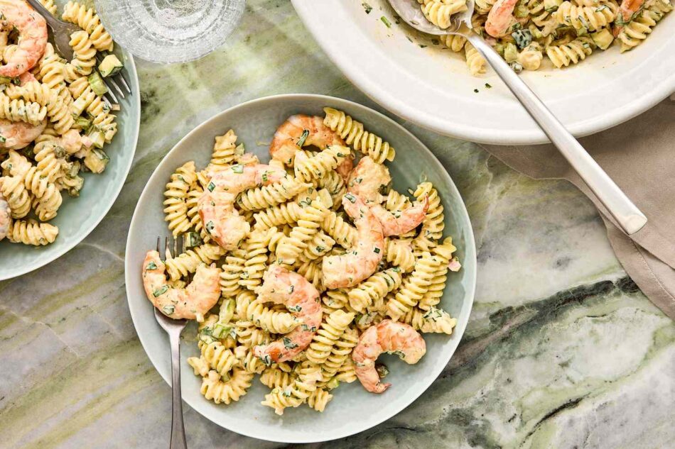 The shrimp remoulade pasta salad has an assertive bite from a mayonnaise-buttermilk sauce base that’s made with horseradish, capers, and hot sauce. Crunchy vegetables and shrimp provide balance and texture. The squash provides a sweet, mild flavor when paired with bolder-tasting ingredients. This would make a great lunch or lighter