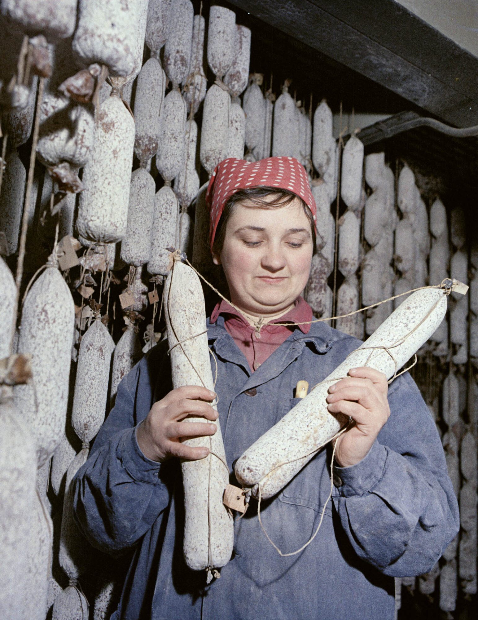 Mrs Zoltán Bite checks the salami sticks in the air-conditioned curing and drying room at the 100-year-old Szeged Salami Factory, founded in 1869 by Márk Pick, a produce merchant, on 17 January 1969. PHOTO: Sándor Mező/MTI