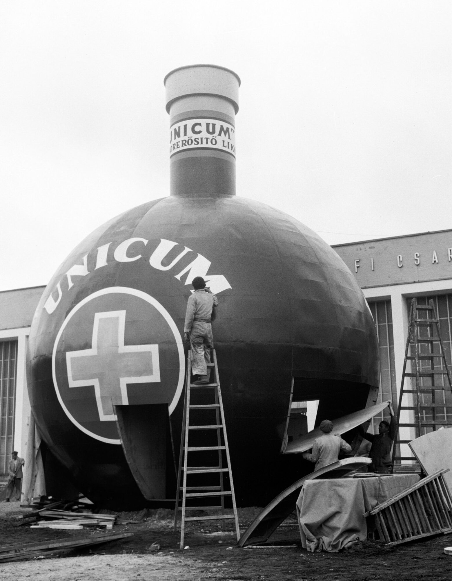 The Zwack factory decorations are being constructed before the opening of the Budapest Industrial Fair, Budapest, 28 May 1957. PHOTO: Béla Jármai/MTI