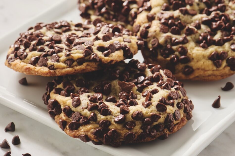 A plate of large chocolate chip cookies is shown on a white marble surface, with extra chocolate chips scattered nearby.A plate of large chocolate chip cookies is shown on a white marble surface, with extra chocolate chips scattered nearby.Pin