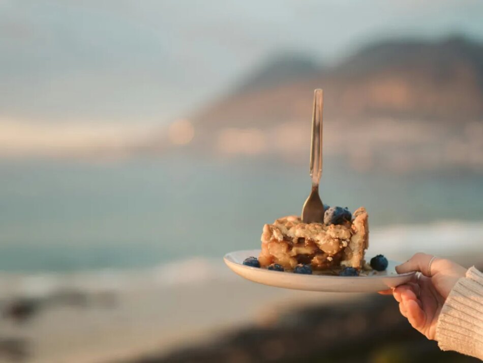 Grab a bowl to mix the crisp layer that goes on top. Flour, brown sugar, and other ingredients go in. Cut the mixture together with a pastry cutter, then pour the crumbly topping on top of the baking dish with blueberries. It bakes for 45 minutes, then sits and cools for a while after it’s done to “let it settle in” and “thicken” the filling, according to Drummond.