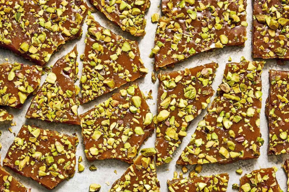 Candy-making never looked easier or more delicious than with this baklava-inspired toffee recipe. It’s delightfully snappy and buttery with a pleasant crunch. The cinnamon lends its fragrant warmth, while honey’s floral notes enhance the candy’s nuttiness. Roasted, salted pistachios add both a pop of color and a tasty saltiness that’s perfectly balanced by the deep, caramel flavors of the toffee. Serve after a dinner party for dessert or pack it up for seasonal gifting.