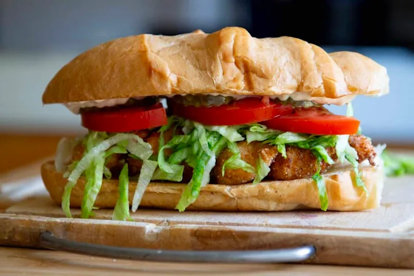 Crispy shrimp, shredded lettuce, tomato, and remoulade on a French roll. Light crunch, big satisfaction.