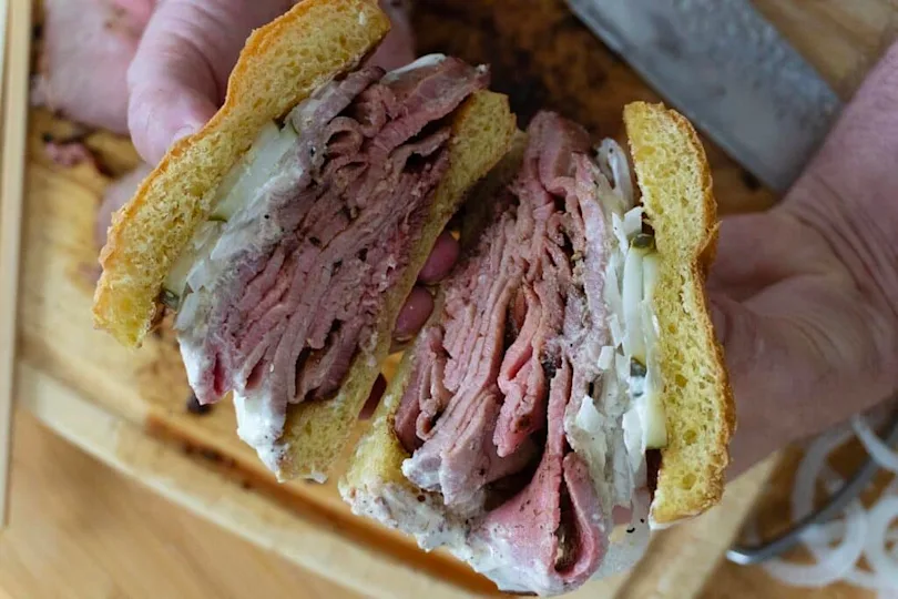Roast beef on a salty kummelweck roll with caraway and a hit of horseradish. The roll makes the rules here.