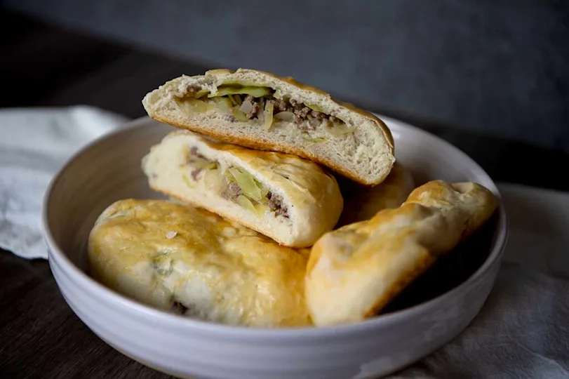 Seasoned beef and cabbage sealed inside golden bread. Portable comfort with steam you can see.
