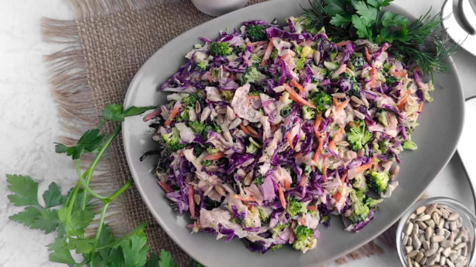 Light and refreshing, with a creamy dressing that coats every bite, this salad offers robust flavor and color. It’s perfect for picnics or as a side dish for dinner. It features purple cabbage, napa cabbage, and broccoli florets.