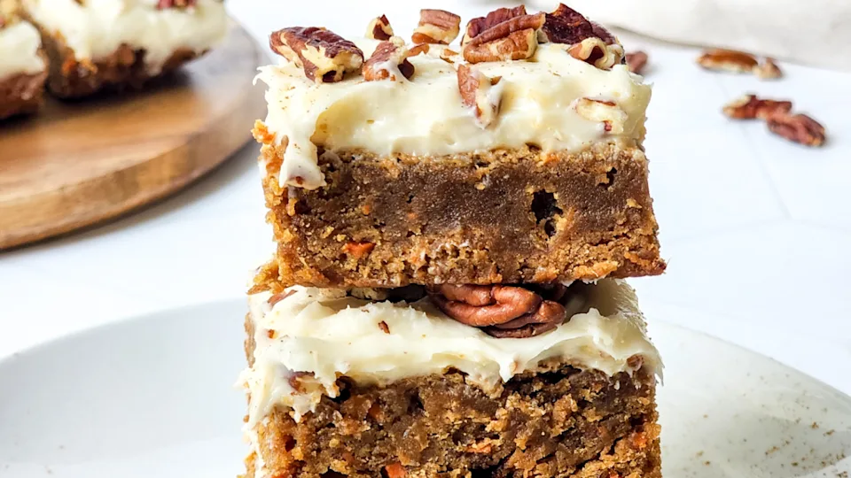 These Carrot Cake Blondies bring together the best of both worlds. They have all the warm spices, fresh carrots, and crunchy pecans you love about carrot cake, combined with the rich, buttery goodness of blondies.