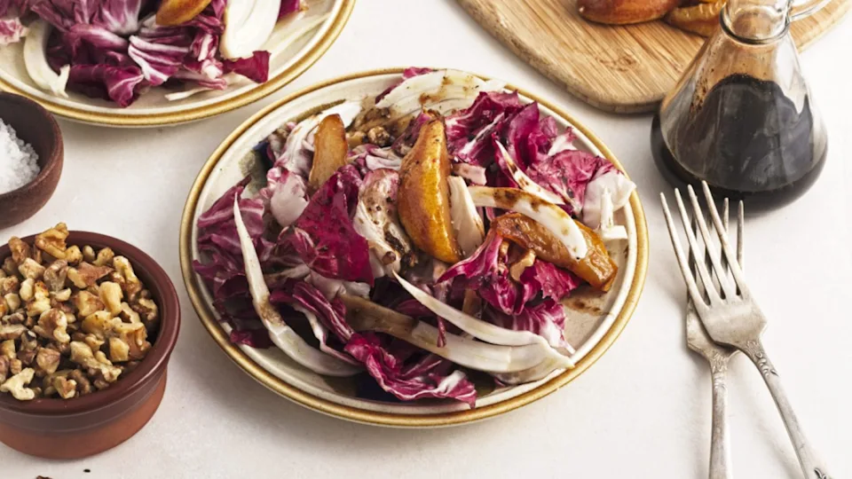 This simple and delicious pear and radicchio salad showcases the best of fall flavors. Sweet pears balance the radicchio’s slight bitterness, complemented by toasted pecans and a light vinaigrette. The vibrant, colorful result—featuring eye-catching Chioggia radicchio—makes a perfect side dish for meat or fish and a great addition to healthy weeknight dinners.