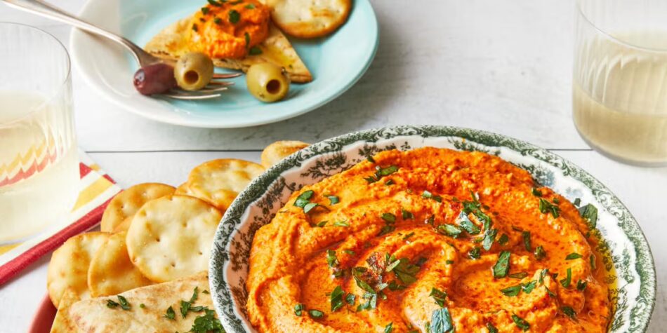 With a vibrant orange hue and a savory flavor, this riff on classic hummus feels just right for Halloween. The addition of ground cumin gives this hummus an earthy flavor, while roasted red peppers delivers sweetness and that eye-popping color.