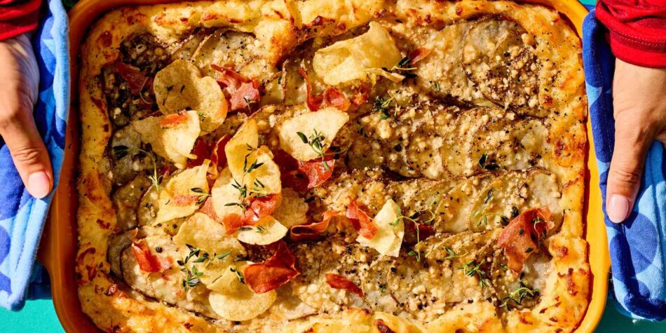 What’s better than a classic, well-loved potato side dish? Two classic, well-loved potato side dishes married into one creamy, gooey, comforting combination of potato greatness. Here, Senior Food Editor Caitlyn Diimig notes, “The sliced potatoes on top add a crispy texture, which is the perfect complement to the smooth mashed potatoes beneath. Adding prosciutto adds even more yummy salty bits. For a potato triple-threat, top it all off with potato chips!” This showstopper serves 12, all of whom will be begging for the recipe.