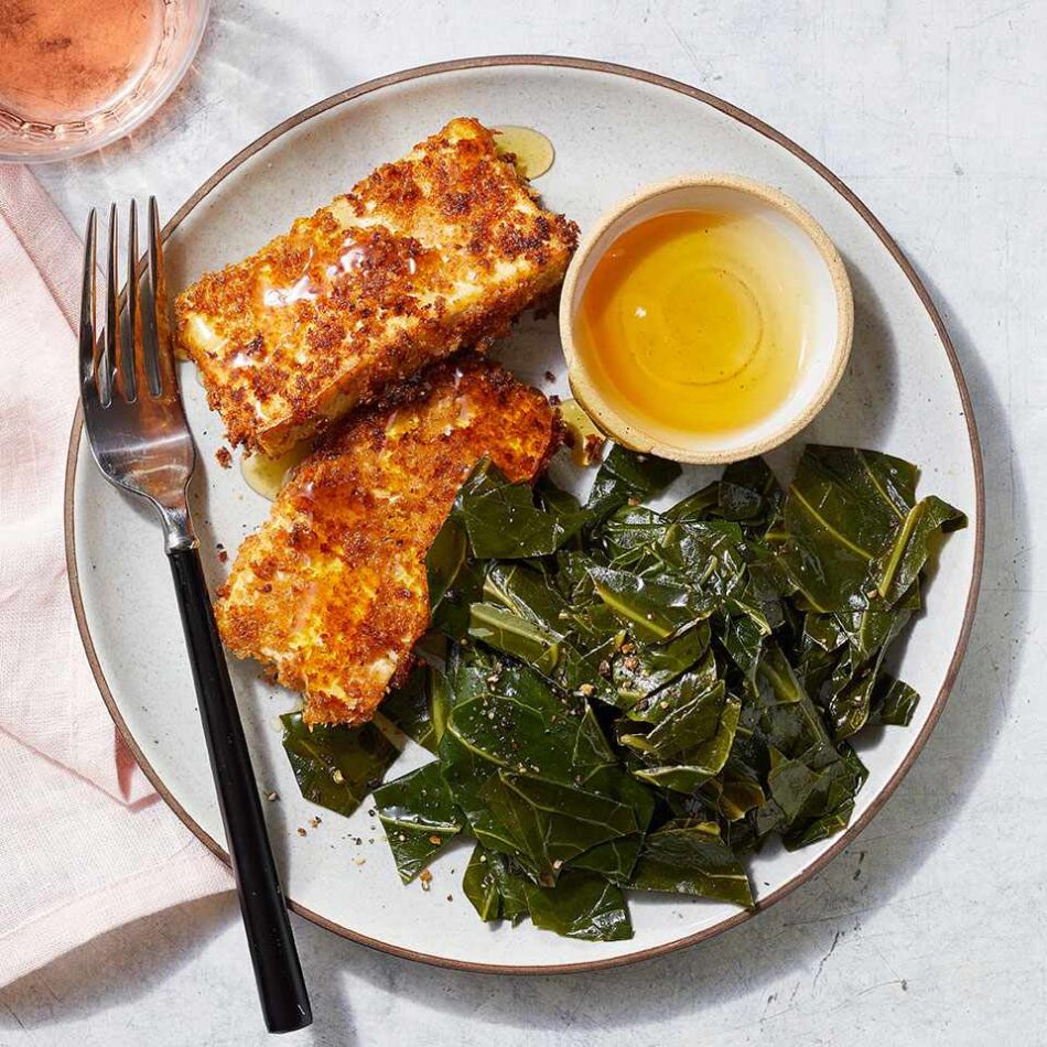 Dipping tofu in buttermilk makes the coating stick for a crispy pan-fried tofu, reminiscent of fried chicken. Spicing up the collards with paprika coats them with smoky flavor while keeping this dish vegetarian. This quick, easy and healthy dinner comes together in just 25 minutes, so it’s great for busy weeknights.
